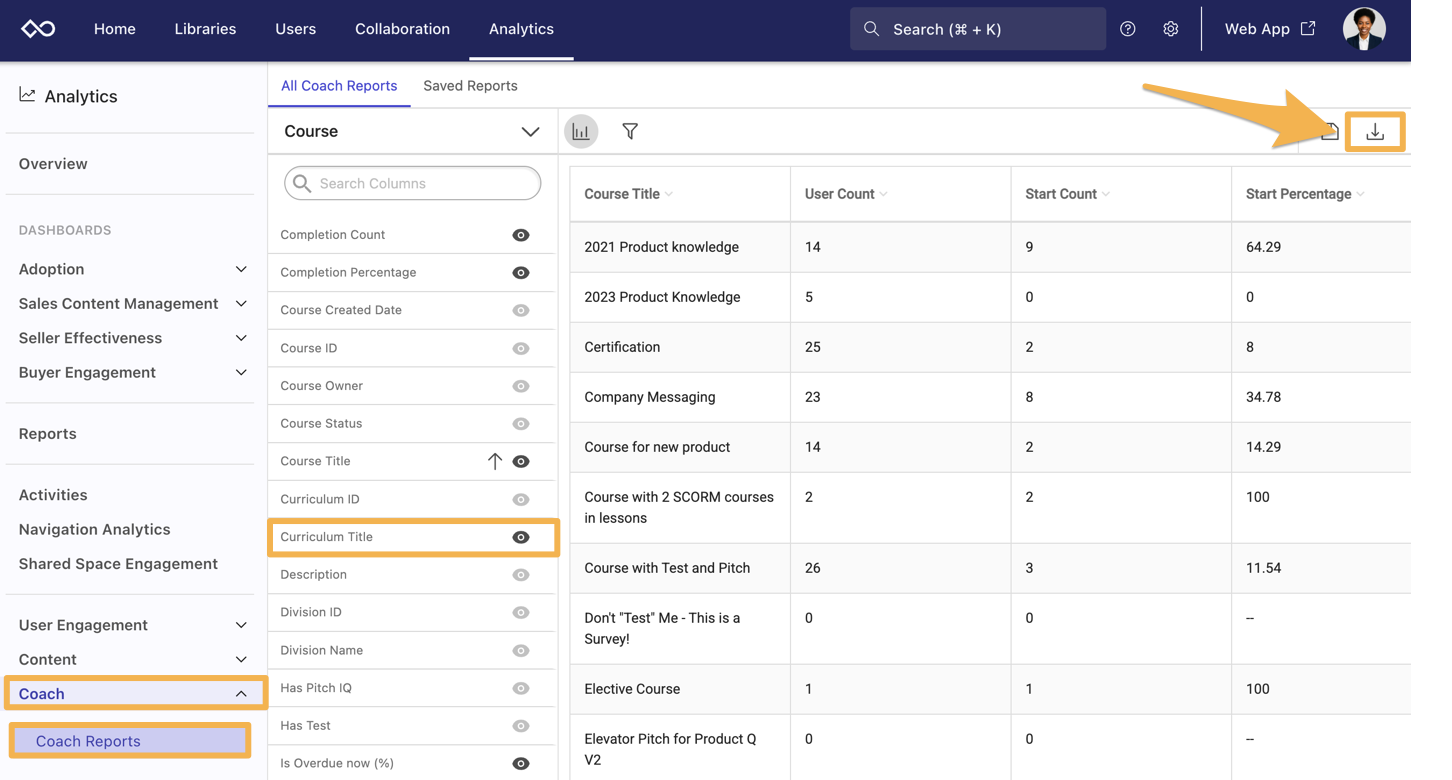Vorbereitung auf die Entfernung der Export-Datenbank Aktualisiert 25. April 2026 15:15 Wir vereinfachen den Zugriff auf Ihre Berichtsdaten und deren Verwaltung. Um ein einheitlicheres Erlebnis zu gewährleisten, wird die Funktion Export Data Bank aus dem Bereich Coach Reports der Admin App entfernt. Sie können die benötigten detaillierten Daten weiterhin über die leistungsstarken Reporting- und Exportoptionen in Ihren Standardkurs- und Benutzerberichten abrufen.Am 6. Mai 2026 wird die Export Data Bank aus dem Coach Reports-Menü entfernt. Folgen Sie den nachstehenden Schritten, um dieselben Daten mithilfe der verfügbaren Kurs- und Benutzerberichte zu exportieren. Navigieren Sie zur Registerkarte Analytics und wählen Sie Coach aus. Wählen Sie entweder den Kurs- oder den Benutzerbericht aus. Um die Daten abzubilden, die zuvor in der Export Data Bank zu finden waren, stellen Sie sicher, dass Sie die Spalte Curriculum-Titel zu Ihrer Berichtsansicht hinzufügen. Wählen Sie dazu Curriculum-Titel im Menü auf der linken Seite aus, indem Sie auf das Augensymbol klicken. Klicken Sie auf das Export-Symbol, um Ihren Bericht als CSV-Datei herunterzuladen.
