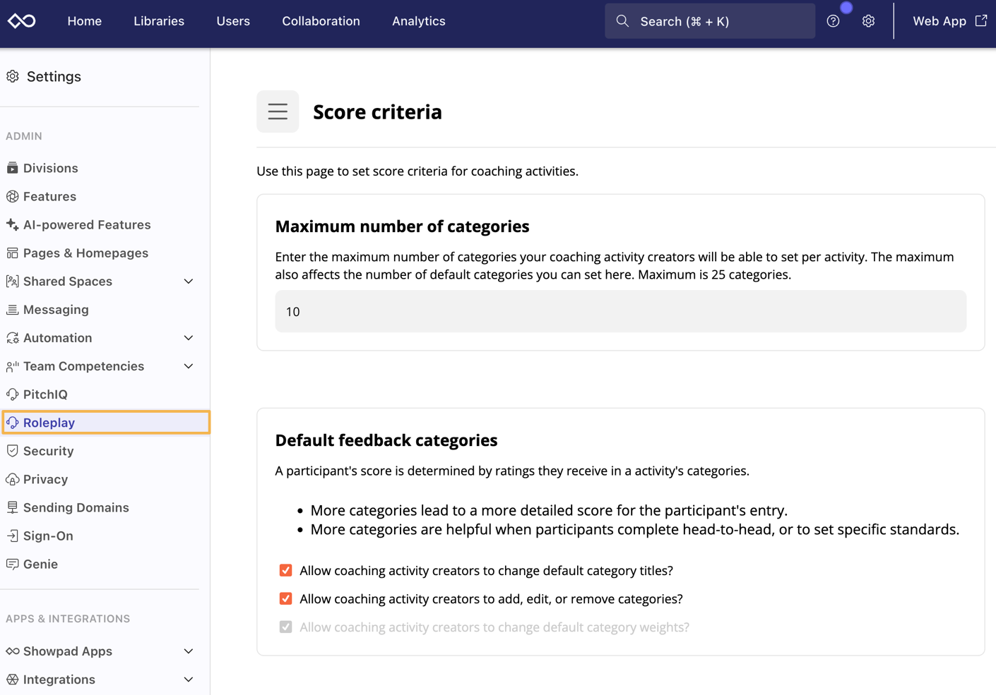Configure Roleplay settings Updated December 31, 2025 07:00 Note: This is a new feature that’s actively being improved, so some details may differ from this article as updates roll out. As an admin, you control the global settings for AI Roleplay activities. This includes configuring default scoring criteria and feedback category settings. It’s important to keep in mind that virtual coaching can effectively evaluate things like language patterns and word choices, conversation structure, active listening indicators, sales techniques, and more. Virtual coaching cannot effectively evaluate things such as non-verbal communication (like body language, facial expressions) or visual materials. It’s best to focus on measurable elements when creating scoring criteria and use clear, objective language. See how it looks Key features Create and manage scoring categories Control scoring criteria for all Roleplay activities. You need this to succeed Plan: eOS Expert, eOS Advanced, eOS Professional Legacy plan: Showpad Coach Essential, Showpad Content Essential, or higher Add-on: Roleplay Permissions: Administrator The quick way Navigate to Settings in the Admin App. Select Roleplay from the left side menu to adjust scoring criteria. Do this step by step Adjust the AI Roleplay scoring criteria Log in to the Admin App. Navigate to Settings. Select the Roleplay setting page from the left side menu. Adjust the maximum number of categories your coaching activity creators will be able to set per activity. The maximum also affects the number of default categories you can set here. Maximum is 25 categories. Update the default feedback categories settings. A participant's score is determined by the ratings they receive in an activity's categories. More categories lead to a more detailed score for the participant's entry, and are helpful when participants compete head-to-head or when setting specific standards. Select the check box for each action that admins or Promoted Members can take: Allow coaching activity creators to change default category titles Allow coaching activity creators to add, edit, or remove categories Allow coaching activity creators to change default category weights Within the table at the bottom, you can manage the various categories. Back to Top Related articles Create and manage Roleplays 2026 Provide private feedback on assets Enable Showpad features using Admin Settings Ensure page groups and specific pages are included in Shares